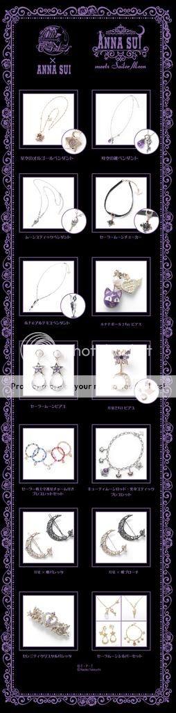 หลังจากที่สินค้าจากการร่วมมือกันระหว่างเซเลอร์มูน X ANNA SUI ประสบความสำเร็จอย่างล้นหลามเมื่อปีที่แล้ว มาในปีนี้โปรเจคนี้ก็ได้กลับมาอีกเป็นครั้งที่ 2 ซึ่งสินค้าเซเลอร์มูนที่ผลิตออกมาแบบดีไซน์สไตล์ ANNA SUI ในครั้งนี้ จะเป็นสินค้าเครื่องประดับและกระเป๋าต่างๆ รวม 21 ประเภท ได้แก่